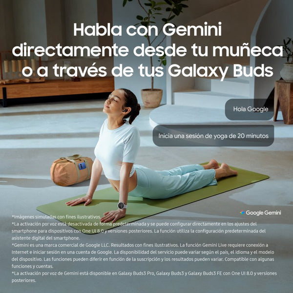 ¡Gemini ya está aquí para ayudarte! Comunícate con tu asistente de voz directamente desde tu Galaxy Watch o a través de tus Galaxy Buds3 FE para hacer todo tipo de preguntas u obtener información al instante. Solo di "Hey, Google" para activarlo y, a continuación, haz tu consulta. También puedes encargarle una tarea o recibir recordatorios de eventos importantes o de cualquier detalle. ¡Y sin usar tus manos!
